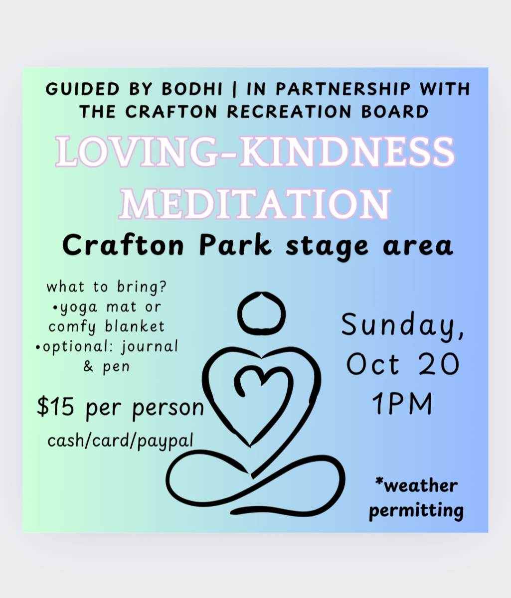 Crafton Recreation Board would like to introduce you to Bodhi. She is a Crafton resident and she is 200HR-RYT Certified Yoga and Meditation Instructor. She will be bringing Meditation to Crafton Park. Her guided meditation is called "Loving-Kindness" and " the values are based in feeling self love and care, while also spreading that same love and care to the members of our community, no matter who they are."