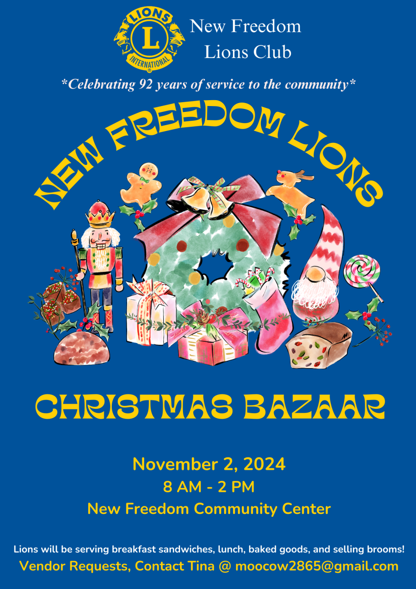 New Freedom Lions Club will host a Christmas Bazaar on November 2, 2024 from 8:00AM-2:00PM at the New Freedom Community Center. Vendors opportunities available!