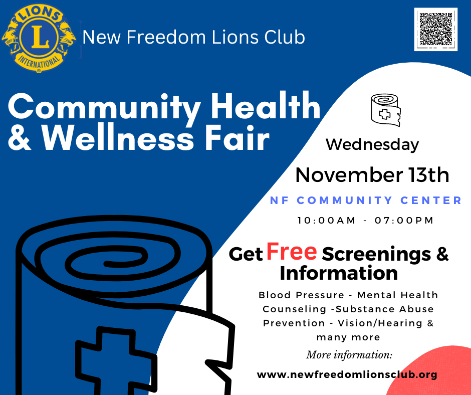 Visit the Community Health and Wellness Fair on November 13, 2024 from 10:00AM-7:00PM at the New Freedom Community Center, sponsored by the New Freedom Lions Club.