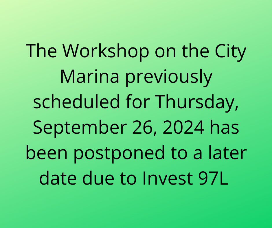 The City Marina Workshop previously scheduled for Thursday, September 26, 2024 at 5 p.m. has been POSTPONED to a later date.
