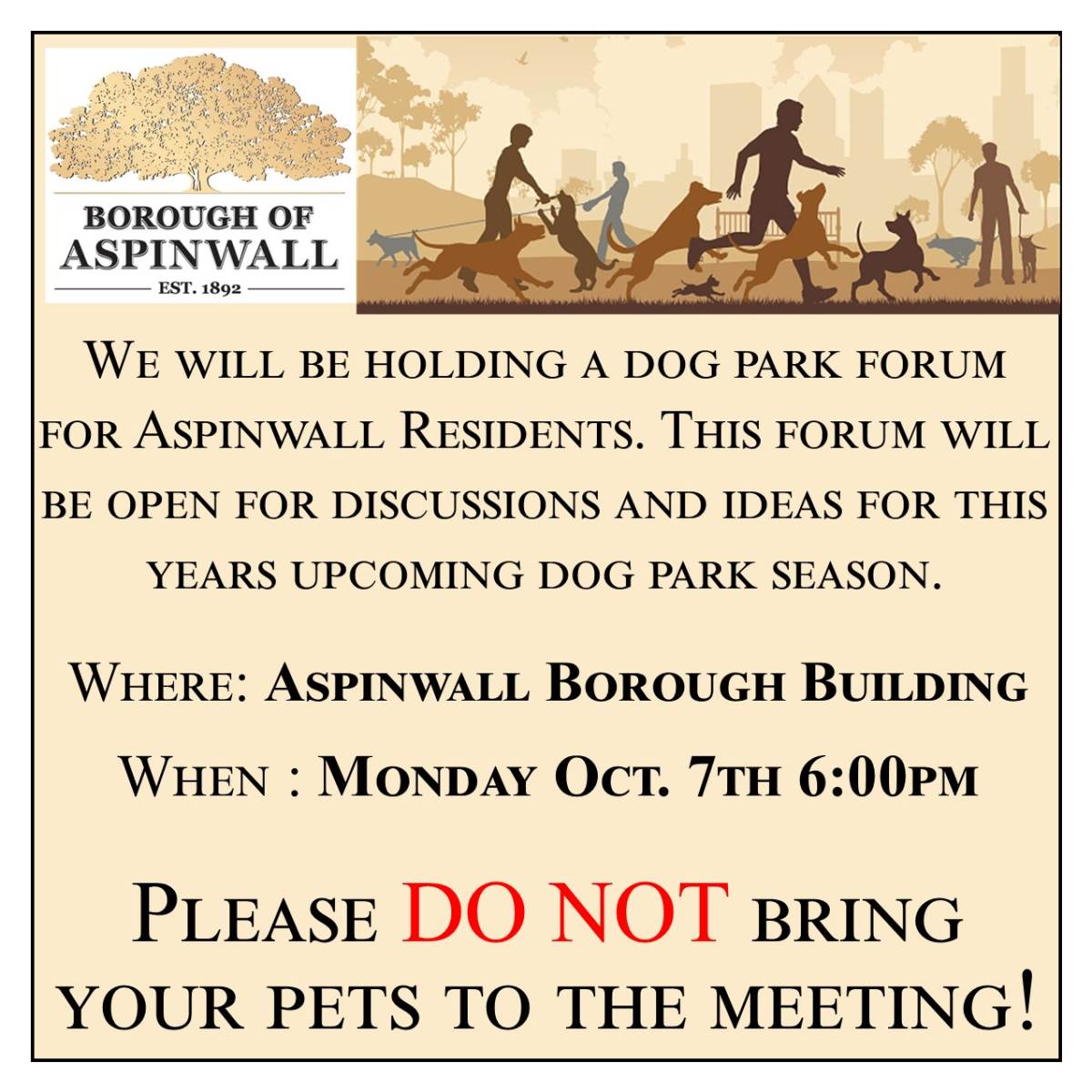 We will be holding a dog park forum for Aspinwall Residents. This forum will be open for discussions and ideas for this years upcoming dog park season.