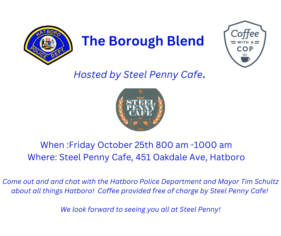 Come out and chat with the Hatboro Police Department and Mayor Tim Schultz about all things Hatboro! Coffee provided free of charge by the Steel Penny Cafe!