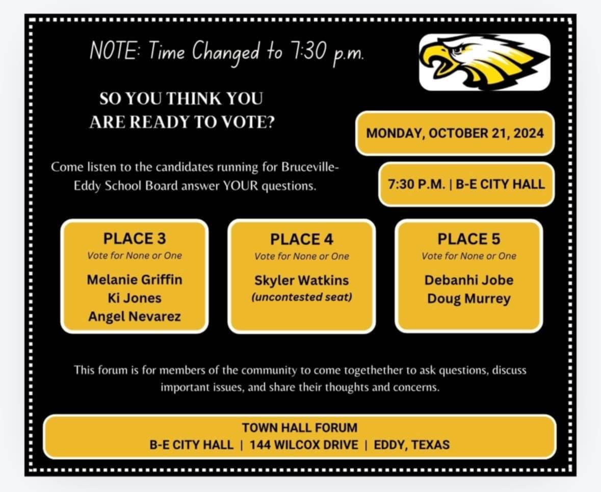 All six candidates for BEISD School Board have been invited to a forum to take place at Bruceville-Eddy City Hall on October 21st, 2024 starting at 7:30 p.m.