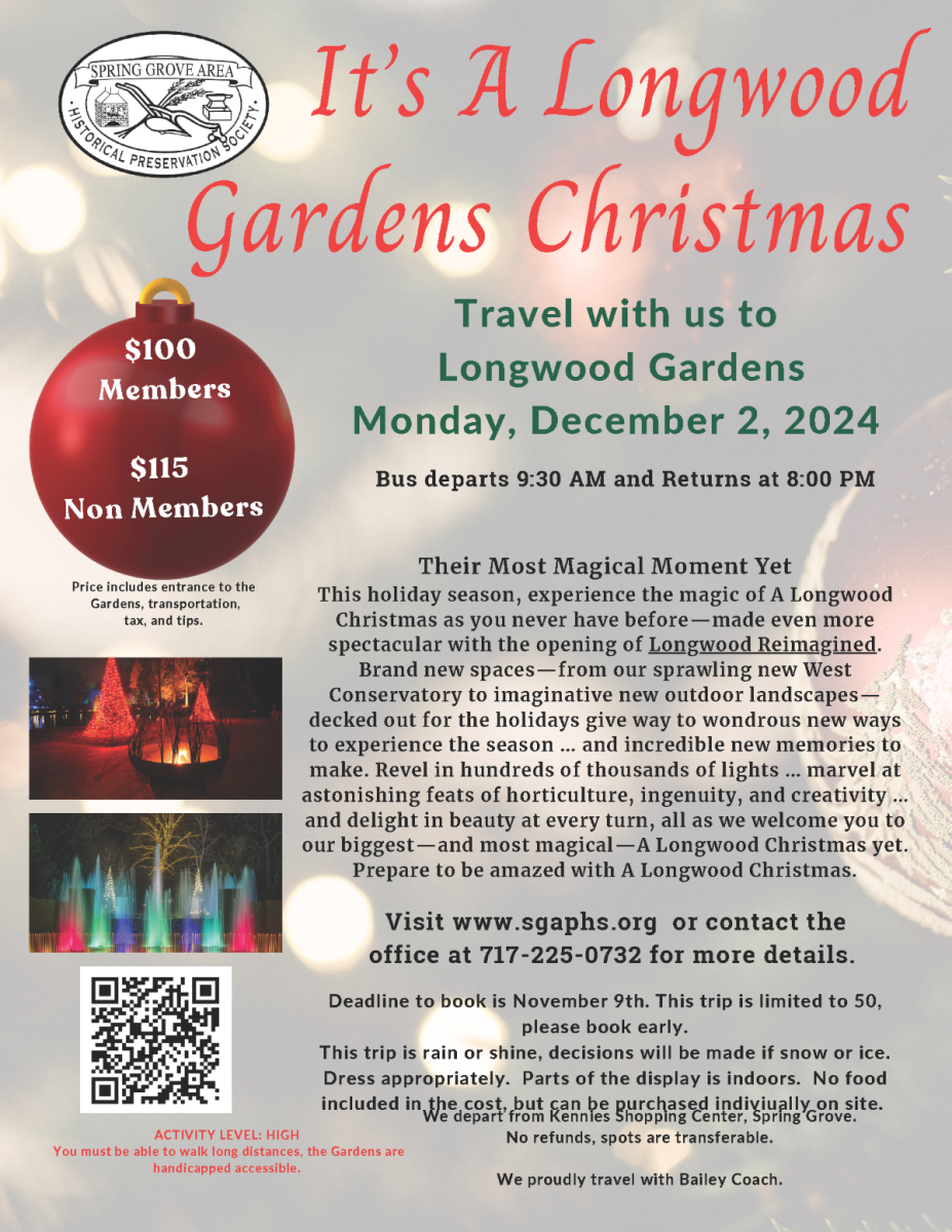 Travel with us to Longwood Gardens Monday, December 2, 2024. Bus departs at 9:30am and returns at 8:00pm. The deadline to book is November 9th. Visit www.sgaphs.org or contact the office at 717-225-0732 for more details.