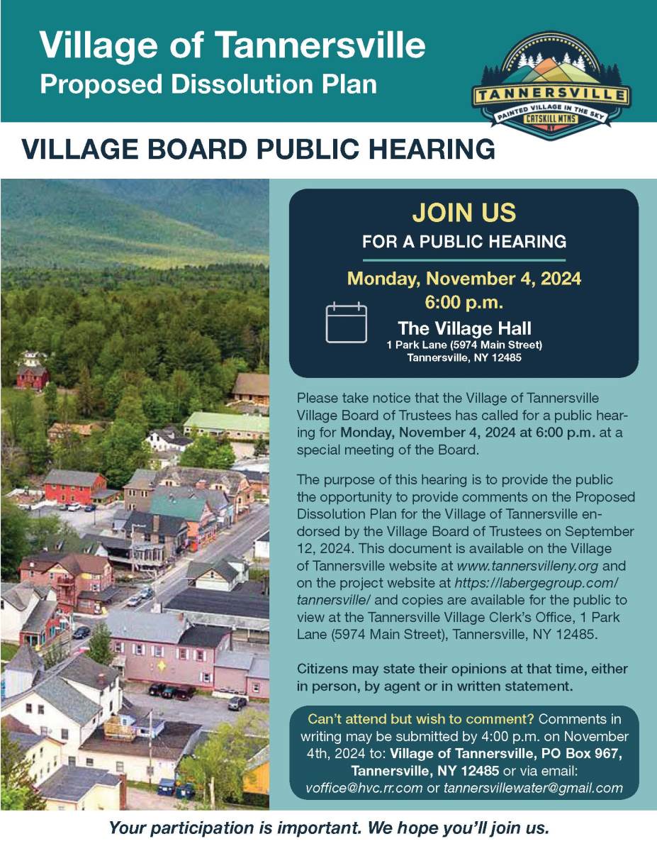 All interested parties and citizens will be given an opportunity to be heard in reference to the above Proposed Dissolution Plan on November 4, 2024 at 6 p.m. at Village Hall. Citizens may state their opinions at that time, either in person, by agent or in written statement. Comments in writing may be submitted by 4:00 PM on November 4th, 2024 via mail to Village of Tannersville, PO Box 967, Tannersville, NY 12485, via email to voffice@hvc.rr.com or tannersvillewater@gmail.com.