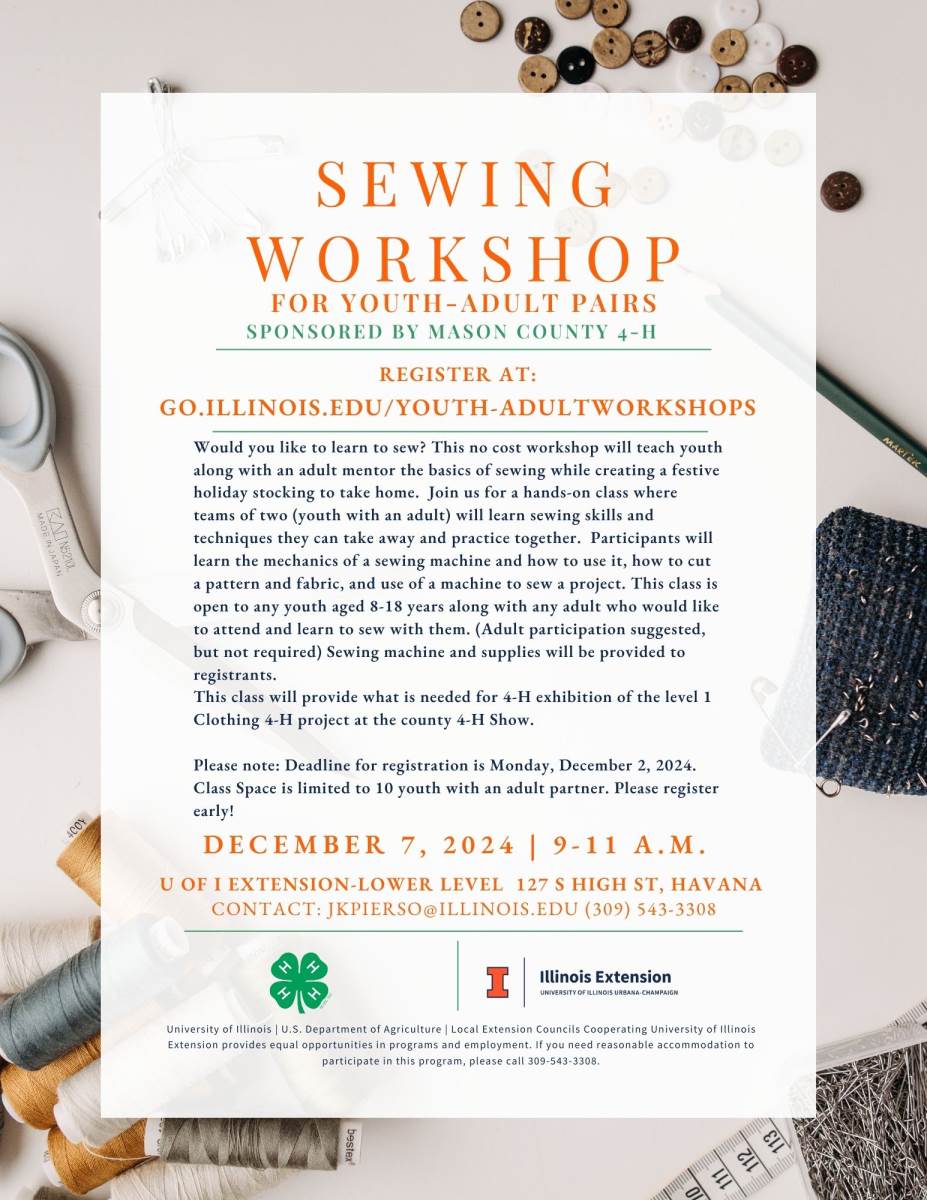 Mason County 4-H is sponsoring a free workshop that will teach youth along with an adult mentor the basics of sewing while creating a festive holiday stocking to take home. Join us for a hands-on class where teams of two (youth with an adult) will learn sewing skills and techniques they can take away and practice together. Participants will learn the mechanics of a sewing machine and how to use it, how to cut a pattern and fabric, and use of a machine to sew a project. This class is open to any youth aged 8 - 18 years along with any adult who would like to attend and learn to sew with them. (Adult participation suggested, but not required). Sewing machine and supplies will be provided to registrants.