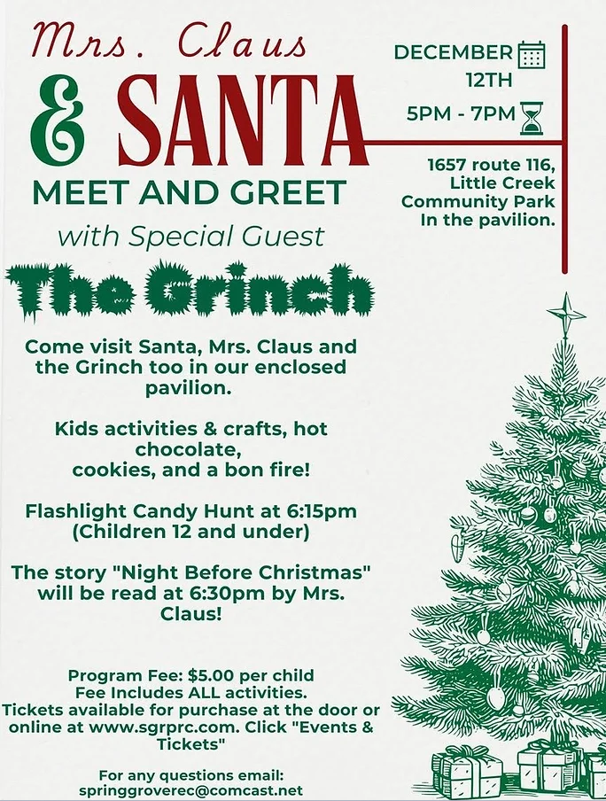 Come visit Santa, Mrs.Claus and the Grinch in our enclosed pavilion!