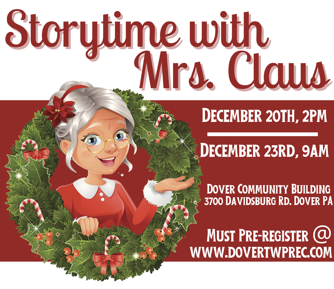 Mrs. Claus is going to come share some fun Christmas stories with the children (and adults) of Dover PA on December 20th at 2 pm. Registration is required so we have enough cookies and hot chocolate for everyone!