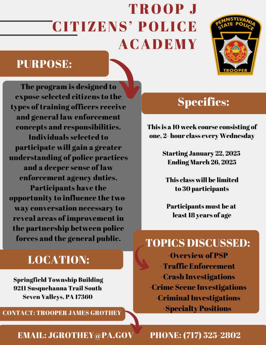 Pennsylvania State Police are offering a 10 week course for citizens to learn and understand police practices and the laws the agency follows. See the attached brochure for dates and times, also contact information.