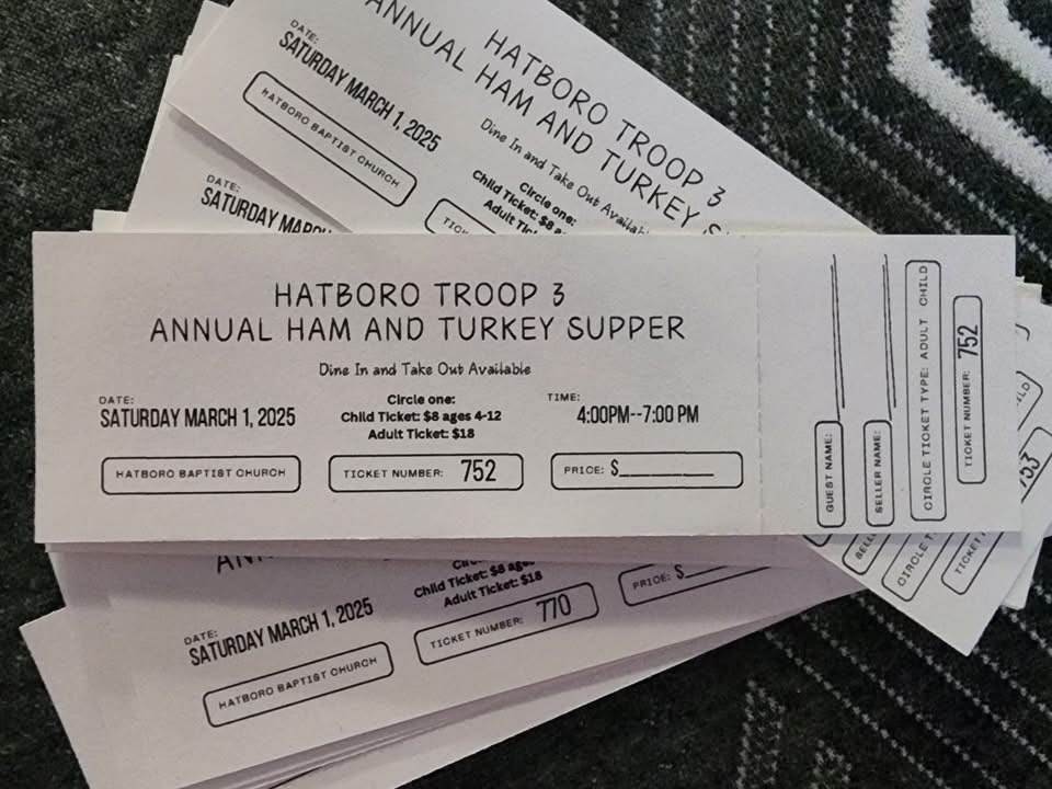 Join us for a delicious Ham and Turkey Supper hosted by Hatboro Troop 3! Your support helps fund the boys activities, equipment, and community service projects. Don't miss out on a hearty meal to support a great cause.