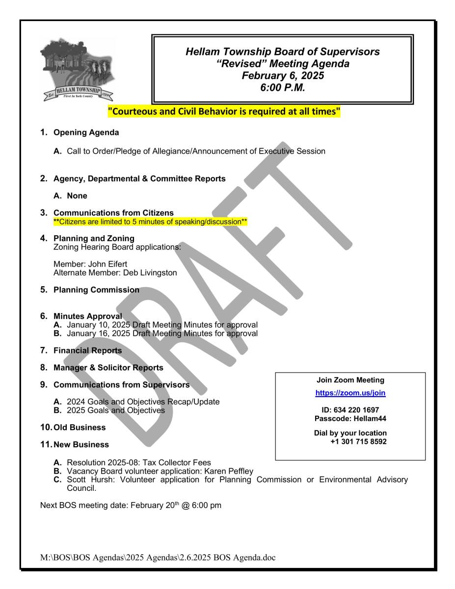 All meetings are now in person, but you may also join via Zoom. For accommodations, please contact the Township manager, Corina Mann, at cmann@hellamtownship.com.