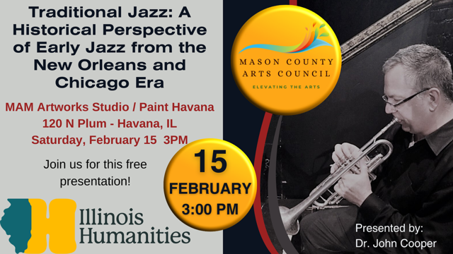 Traditional Jazz: A Historical Perspective of Early Jazz from the New Orleans and Chicago Era. Sponsored by the Mason County Arts Council and Illinois Humanities. Join them for this free presentation! Presented by Dr. John Cooper. MAM Artworks Studio/Paint Havana, 120 North Plum - Havana. Saturday, February 15, 2025 - 3 p.m.