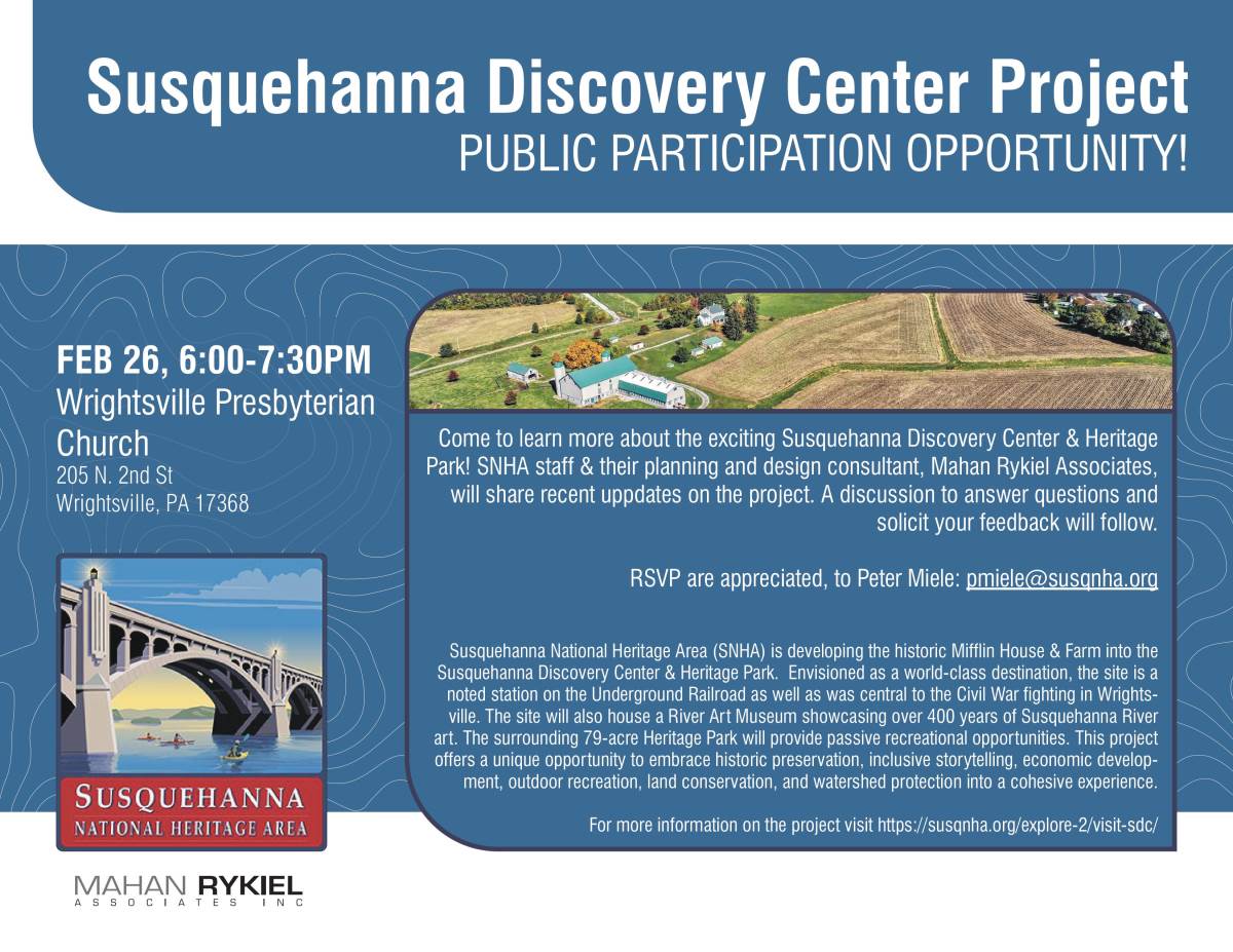 On Wednesday, February 26th from 6:00pm until 7:30pm, Susquehanna National Heritage Area will host a public information and participation session on the new Susquehanna Discovery Center & Heritage Park at the historic Mifflin Farm. Our Master Planning consultants from Mahan Rykiel Associates will facilitate this session in the sanctuary at Wrightsville Presbyterian Church, 205 N. 2nd Street, Wrightsville. They will present conceptual plans for the project and invite your feedback as we continue to refine our designs. For more information, and to RSVP, please visit https://susqnha.org/public-participation-opportunity-2/