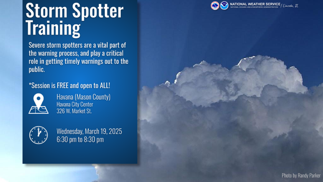 Severe storm spotters are a vital part of the warning process and play a critical role in getting timely warnings out to the public. This session is FREE and open to ALL! Wednesday, March 19, 2025 - 6:30 p.m. to 8:30 p.m. - Havana City Center - 326 Wet Market Street.