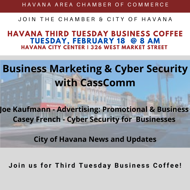 Join us for Third Tuesday Business Coffee on Tuesday, February 18, 2025 at 8 a.m. at Havana City Center - 326 West Market Street. Joe Kaufmann will be discussing Advertising: Promotional & Business and Casey French will discuss Cyber Security for Businesses.