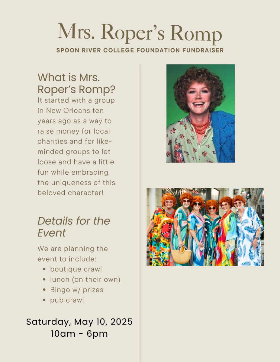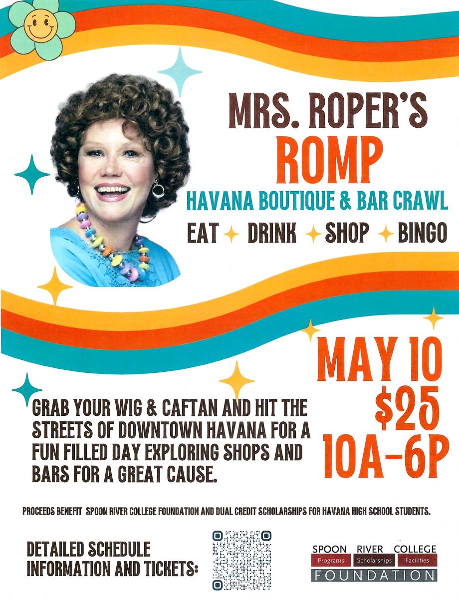Mrs. Roper's Romp from "Three's Company" television show. It started with a group in New Orleans, ten years ago as a way to raise money for local charities and for like minded groups to let loose and have a little fun while embracing the uniqueness of this beloved character! The event will include a boutique crawl, lunch (on their own), Bingo with prizes and a pub crawl.
