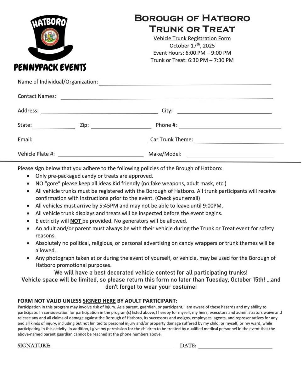 To register your trunk, please contact Borough Hall at 215-443-9100 or download the registration form and email it to Rob Jacobus at rjacobus@myhatboro.org