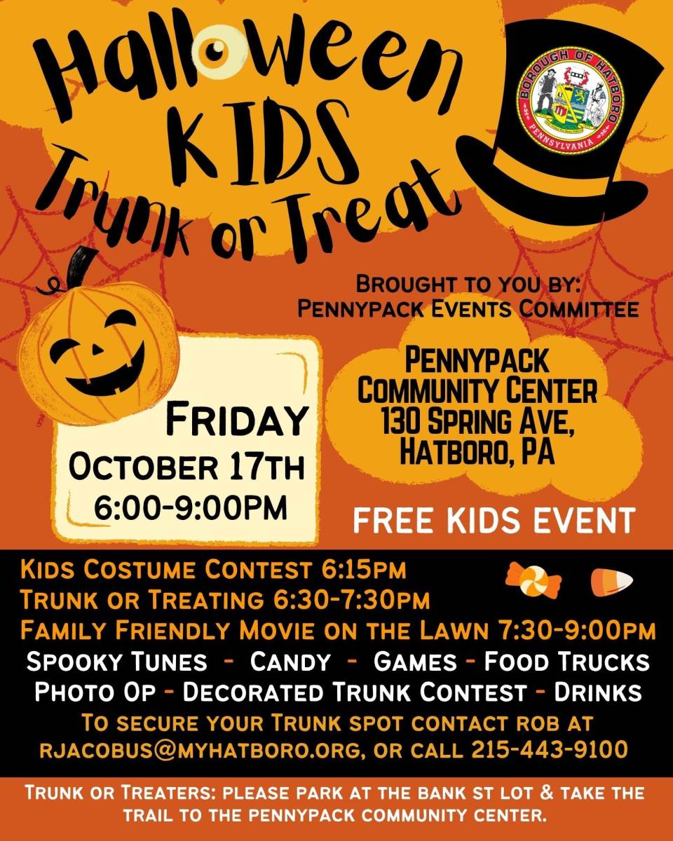 Join the Pennypack Events Committee for the annual Trunk or Treat event taking place on Friday, October 17, 2025 from 6 PM to 9 PM at the Pennypack Community Center, 130 Spring Avenue, Hatboro, PA 19040.