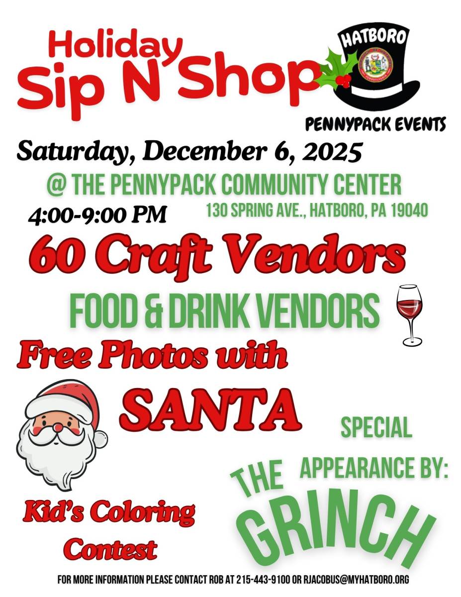 Join the Pennypack Events Committee for the annual Holiday Sip N Shop on Saturday, December 6, 2025. This event is taking place at the Pennypack Community Center, 130 Spring Avenue, Hatboro, PA 19040 from 4 PM to 9 PM.