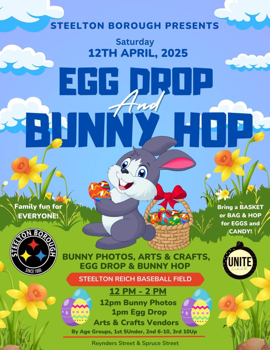 - Fri, Apr 11 @ 9:33am - The event's location and description were changed. Message from Steelton Borough: *LOCATION CHANGE* The 2025 Egg Drop & Bunny Hop will now be hosted at the Steelton Fire Department
