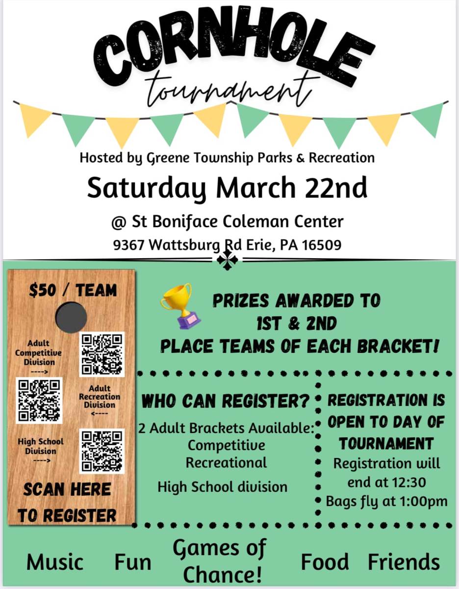 Greene Township Parks and Recreation invites you to join us for an exciting day of fun and friendly competition! Whether you're a seasoned pro or just tossing for fun, this cornhole tournament is the perfect way to enjoy the day with family, friends, and neighbors.