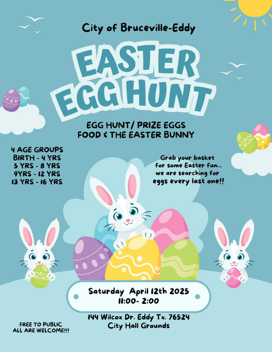 The City of Bruceville-Eddy will be hosting an Easter Egg Hunt located at 144 Wilcox Dr. City Hall Grounds for all to enjoy- please see attached flyer for all information need for this event, we hope to see you all here.
