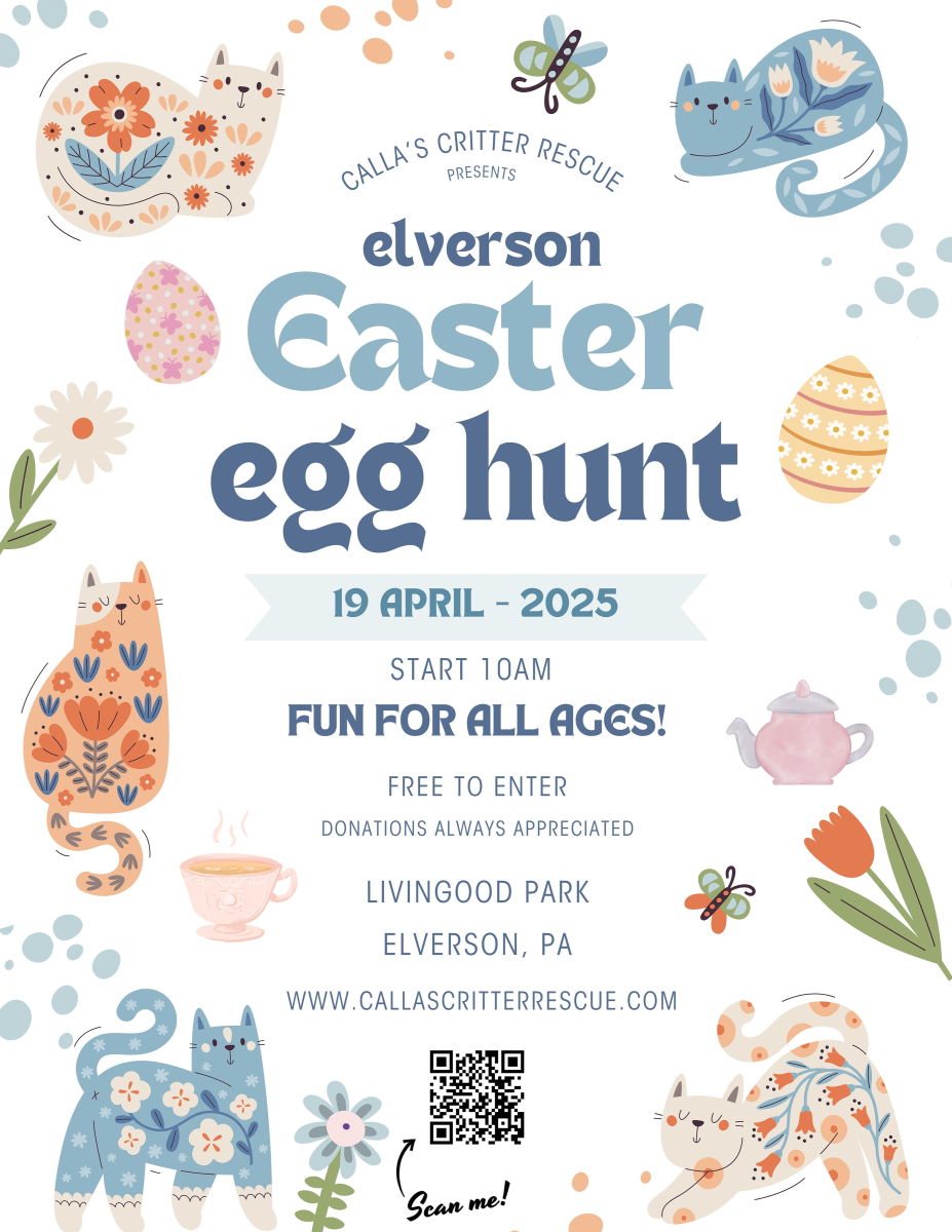 Join us on Saturday, April 19th at 10AM at Livingood Park for a Fun FREE Easter Egg Hunt for all ages. Donations for Callas Critter Rescue will be accepted and appreciated.