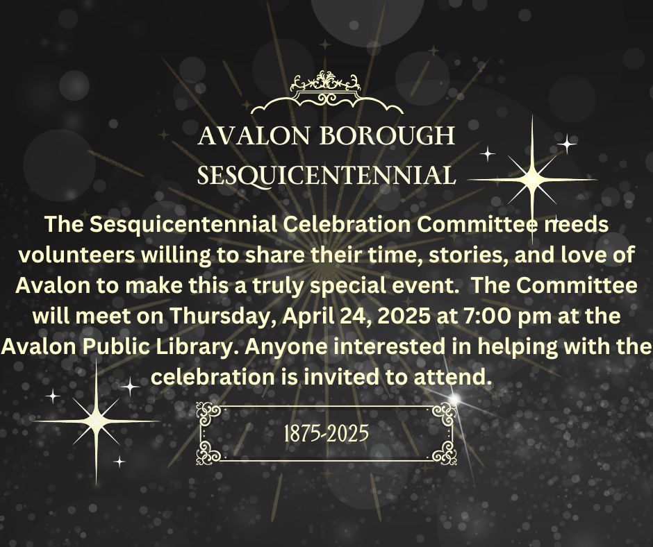 The Sesquicentennial Celebration Committee needs volunteers willing to share their time, stories, and love of Avalon to make this a truly special event. The Committee will meet on Thursday, April 24, 2025, at 7:00 pm at the Avalon Public Library. Anyone interested in helping with the celebration is invited to attend.