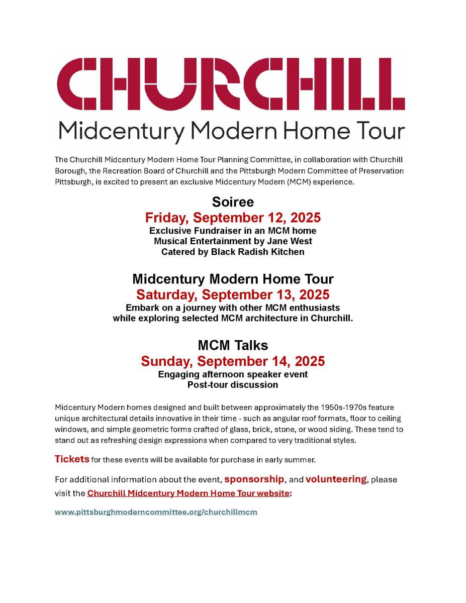 The Churchill Midcentury Modern Home Tour Planning Committee, in Collaboration with Churchill Borough, the Recreation Board of Churchill and the Pittsburgh Modern Committee of Preservation, is excited to present an exclusive Midcentury Modern (MCM) experience.