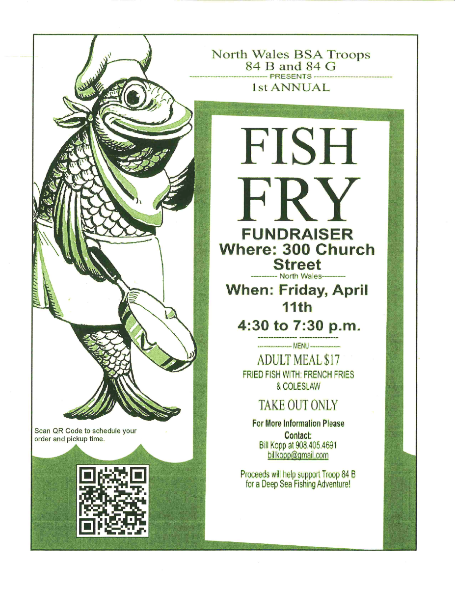 Troops 84B and 84G are holding their first annual Fish Fry Fundraiser. See attached flyer for details. Take Out Only. Follow directions on the flyer to place your order today. Order by April 4th!