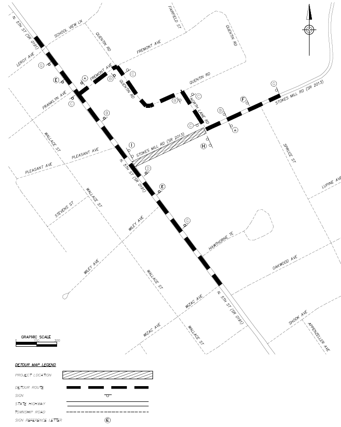 During construction, Stokes Mill Road will be CLOSED to traffic between 5th Street and North Lane Road on weekdays between 8:00 a.m. and 4:00 p.m. The road will be OPEN to traffic outside of this time period. An approved Detour Plan for Stokes Mill Road will be in place during the time the road is closed. Detour signs will be in place to re-route traffic around the construction area on Stokes Mill Road.
