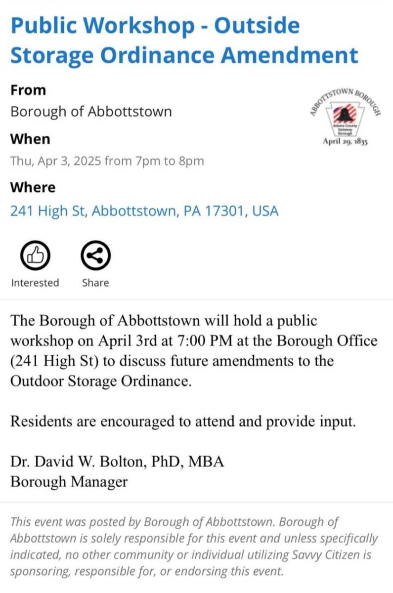 This event was posted by Borough of Abbottstown. Borough of Abbottstown is solely responsible for this event and unless specifically indicated, no other community or individual utilizing Savvy Citizen is sponsoring, responsible for, or endorsing this event.