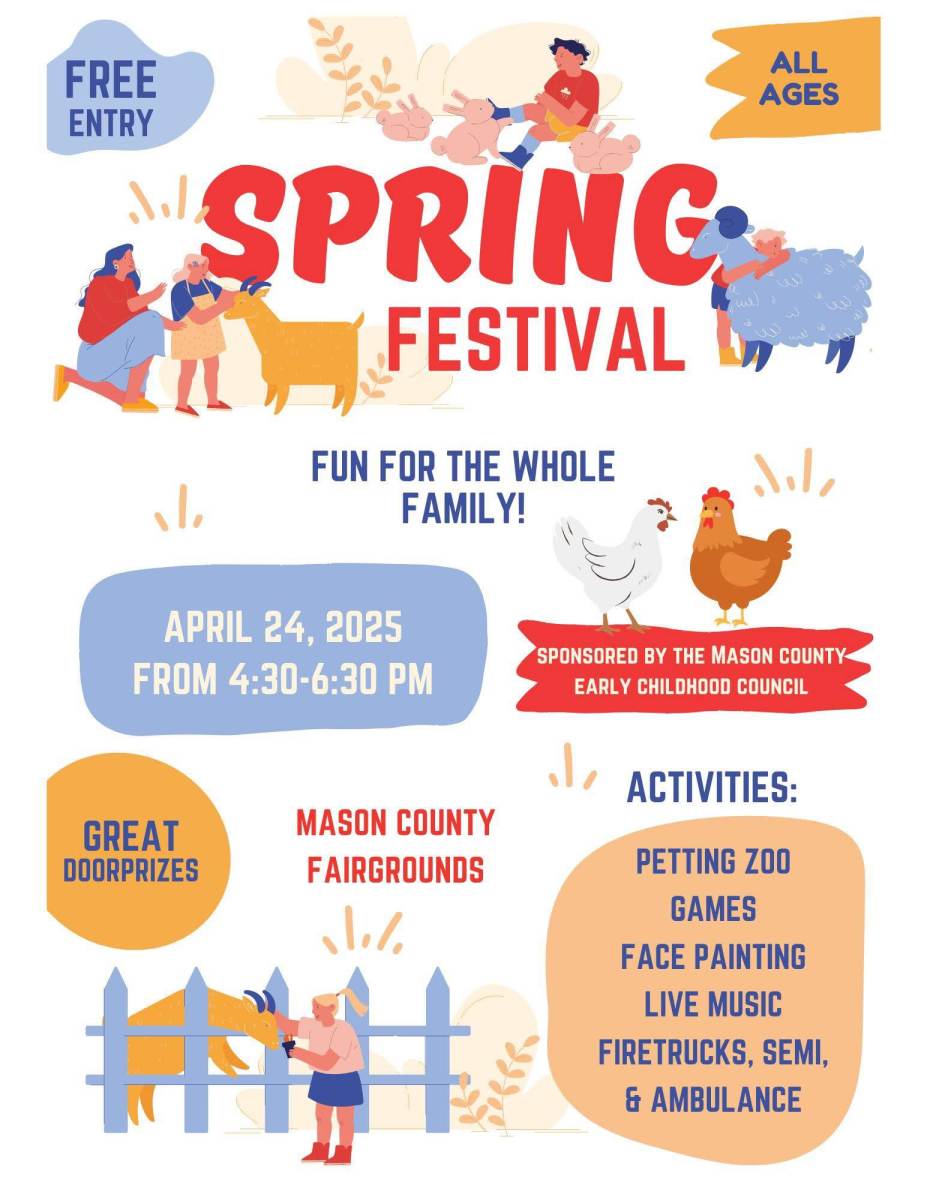 The Spring Festival is being held at the Mason County Fairgrounds on Thursday, April 24, 2025 from 4:30 to 6:30 p.m. Entry to the festival is free and fun for the whole family. There will be a petting zoo, games, face painting, live music, firetrucks, semis, and an ambulance. There will also be great door prizes. This event is sponsored by the Mason County Early Childhood Council.