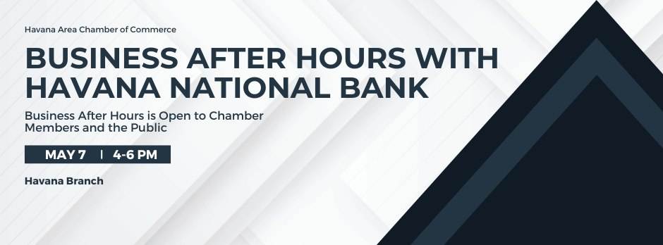 The Business After Hours will meet at the Havana National Bank on Wednesday, May 7, 2025 from 4 p.m. to 6 p.m. Business After Hours is open to Chamber Members and the Public.