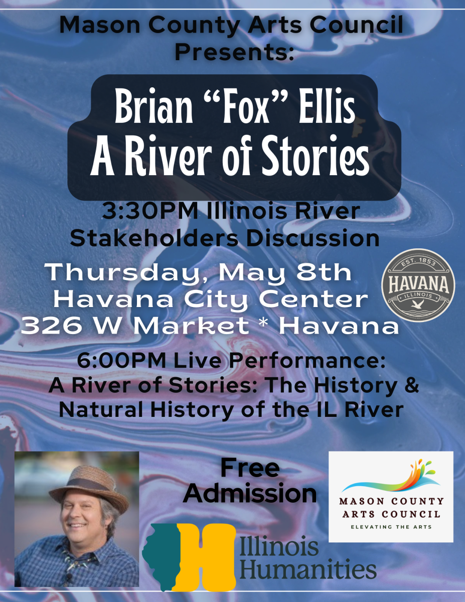 On Thursday, May 8th at 6p.m. at the City Center, the Mason County Arts Council and the City of Havana are presenting a live performance: A River of Stories: The History & Natural History of the Illinois River. Admission is free.