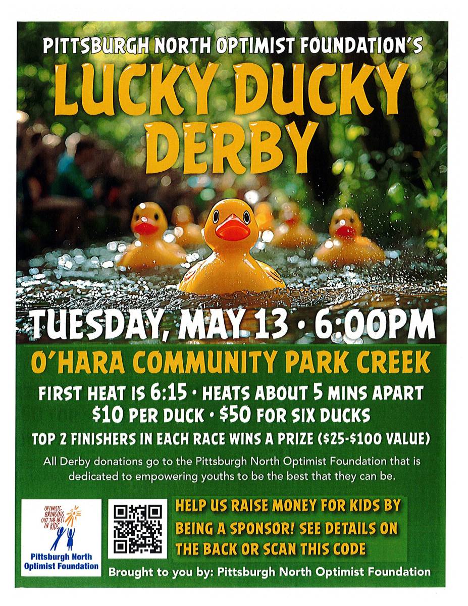 Come join us for the 13th Lucky Ducky Derby fundraiser by the Pittsburgh North Optimist Club. The race will be held at the O’Hara Township Community Park creek on Tuesday, May 13. The first heat is 6:15 and heats are about 5 mins apart. $10 per duck • $50 for six ducks. Top 2 finishers in each race wins a prize ($25-$100 value). All Derby donations go to the Pittsburgh North Optimist Foundation that is dedicated to empowering youths to be the best that they can be. Visit https://www.pittsburghoptimist.com/duck-race for more details and to sponsor the event. Ducks can be bought before the race or at the event. To purchase a duck contact Dave Harford at dave@daveharforddesign.com