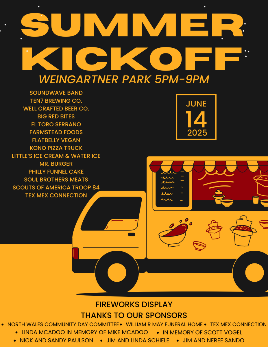 Join us for Summer Kickoff in Weingartner Park from 5pm to 9pm on June 14th. Food trucks, beer, and music.