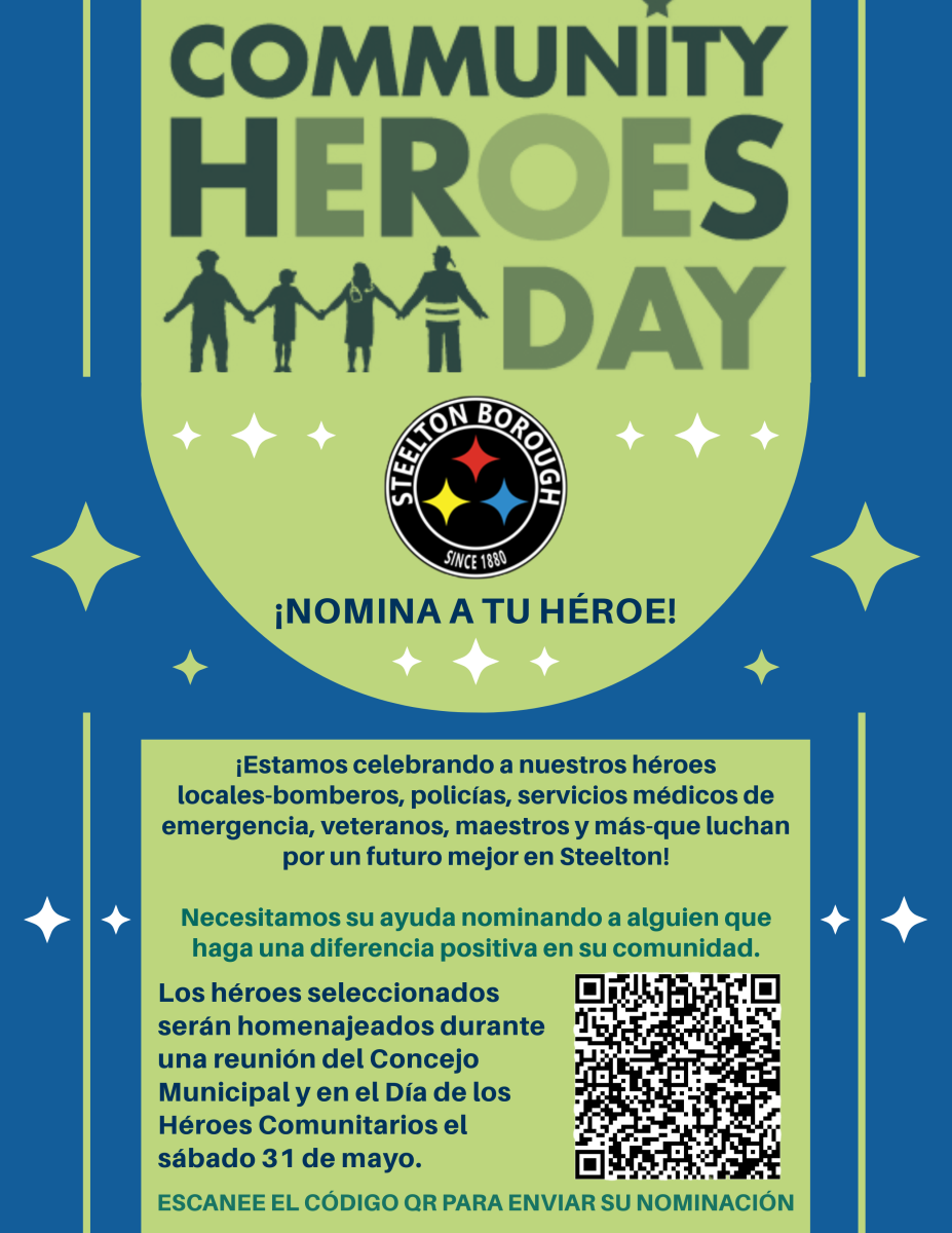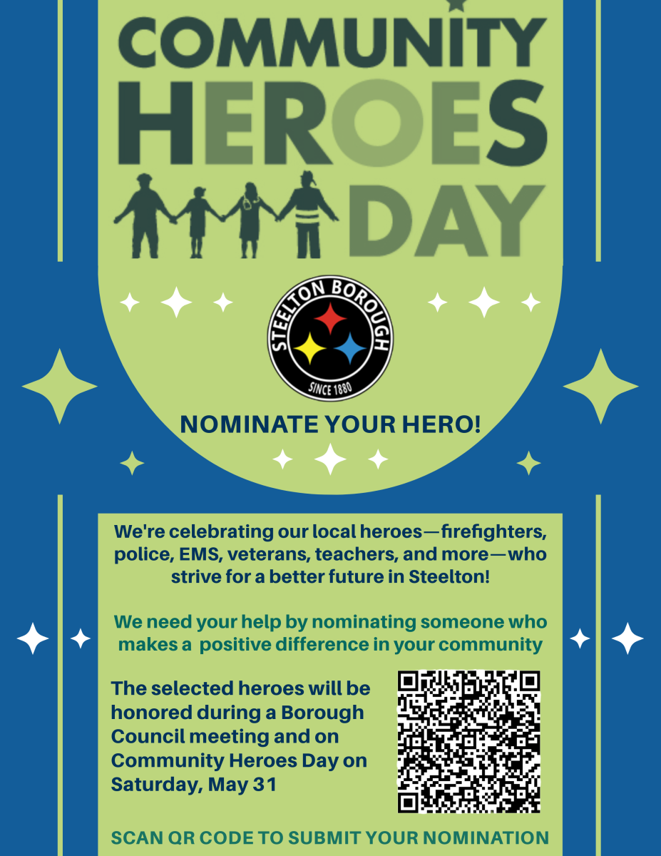 We want to honor local heroes such as firefighters, police officers, EMS, military veterans, community leaders, teachers, doctors, nurses, elected officials, and other individuals who fight for positive change, improve the quality of life & work for a brighter future in Steelton. The selected heroes will be honored during a Borough Council meeting and on Community Heroes Day at the Municipal Building from 11:30 AM to 12:30 PM on Saturday, May 31. To submit your nomination, please click this link to complete the online form: https://forms.gle/xqfGq8oZyxnxgLFJ9