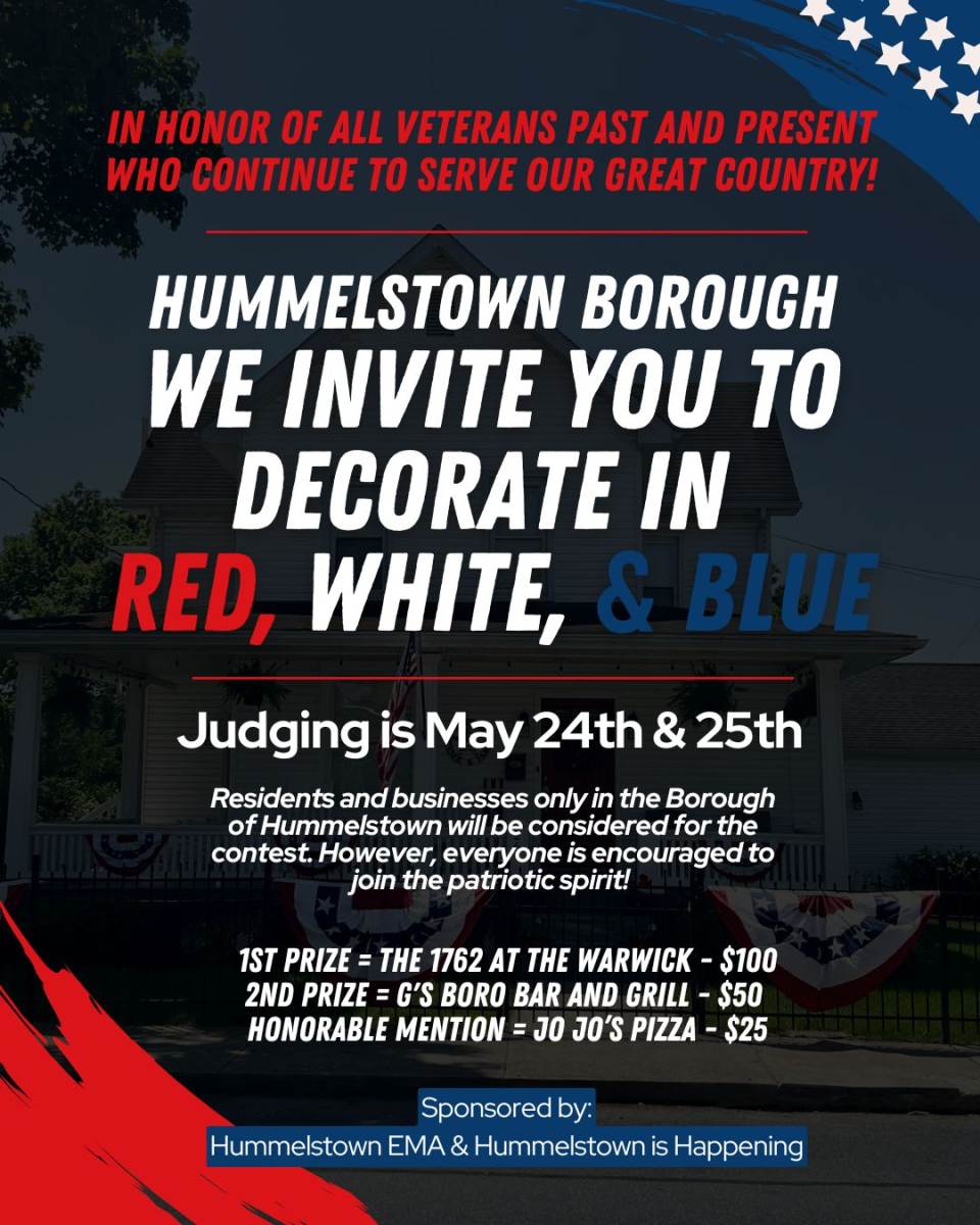 Judging for the Hummelstown Red, White and Blue contact will be on May 24th and 25th! Decorate early - Great prizes to win!