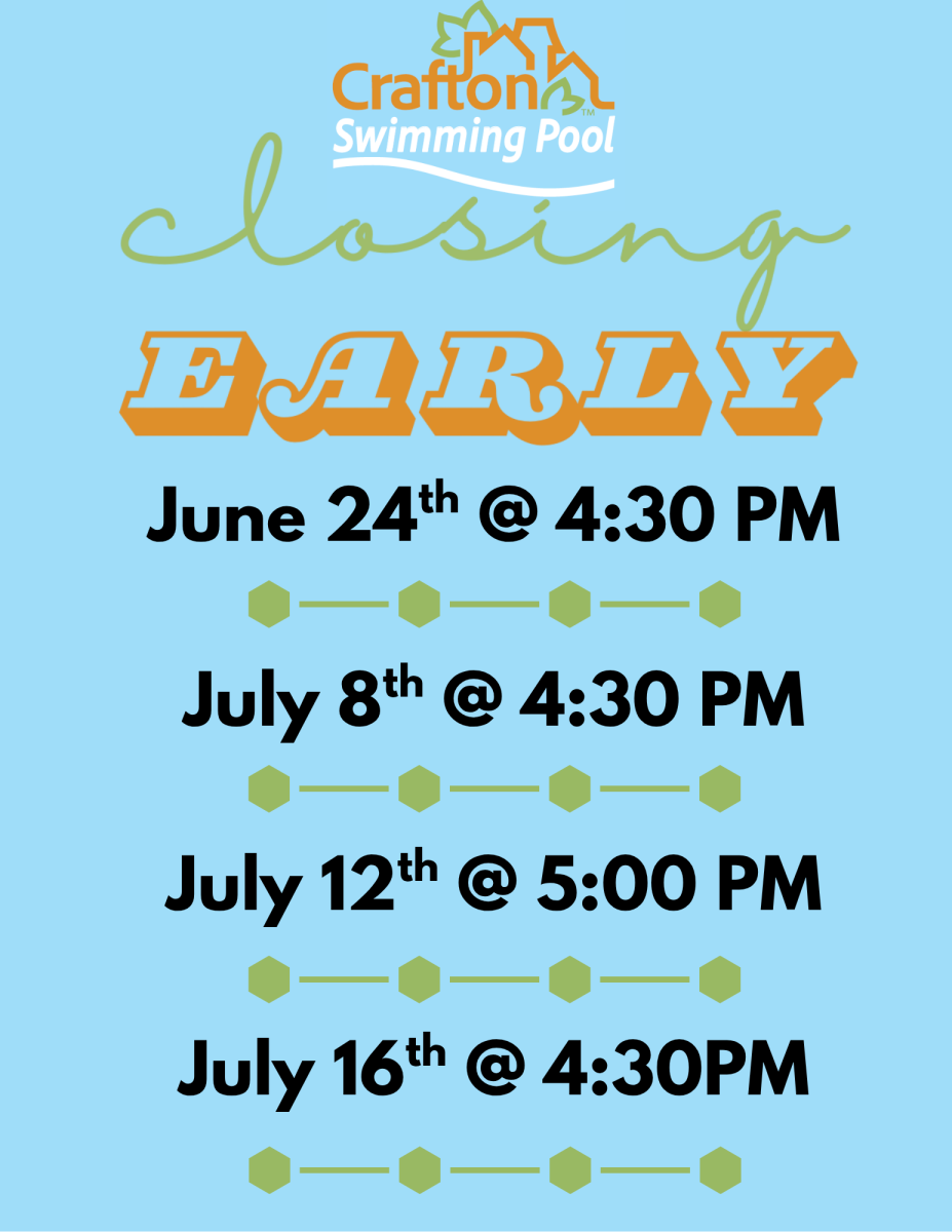 The Crafton Swimming Pool will close early at 4:30 PM, Tuesday, June 24, 2025, due to the home swim meet for the Crafton Crocodiles.