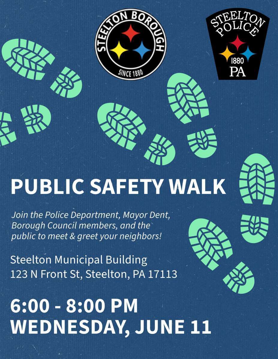 The next Public Safety Walk will start at the Steelton Borough Municipal Building on Wednesday, June 11 at 6:00 PM. We will walk north on Front Street to Brewster Street, then come back along 2nd Street. Join the Police Department, Mayor Dent, Borough Council members, and the public to meet and greet your neighbors!