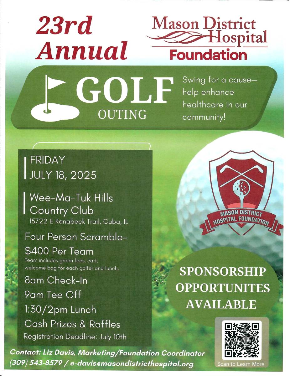 Swing for a cause - help enhance healthcare in our community! There will be a four person scramble - $400 per team to be played at Wee-Ma-Tuk Hills Country Club on Friday, July 18, 2025. 8 a.m. check in with a 9 a.m. tee off. There will be lunch, cash prizes and raffles. Registration deadline is July 10th. There are also sponsorship opportunities. Help support our healthcare!