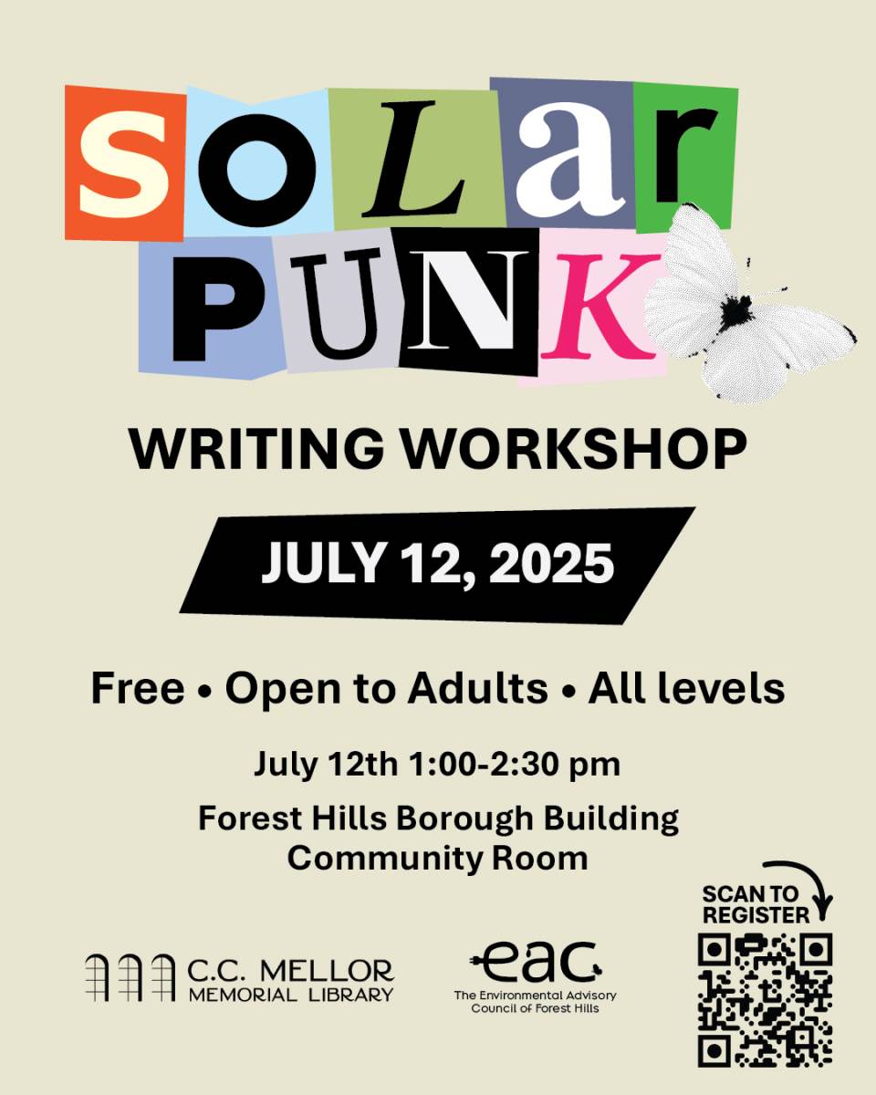 The Forest Hills Environmental Advisory Council and the C. C. Mellor Memorial Library of Forest Hills are hosting a workshop on how to write solarpunk stories and poems. We'll learn how to tell stories set in a utopian future with grounded characters and plausible histories - which can be more challenging, and potentially more impactful, than writing dystopian fiction.
