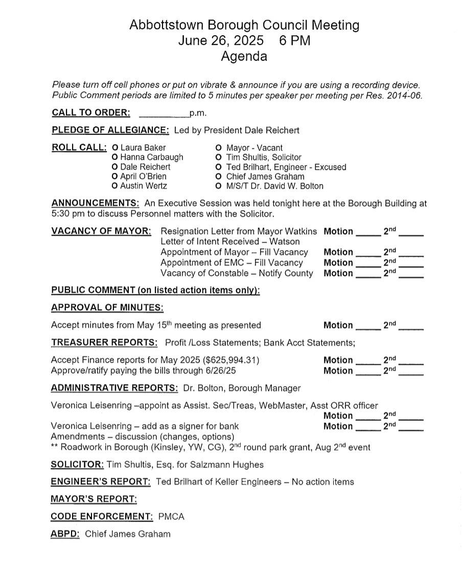 This event was posted by Borough of Abbottstown. Borough of Abbottstown is solely responsible for this event and unless specifically indicated, no other community or individual utilizing Savvy Citizen is sponsoring, responsible for, or endorsing this event.