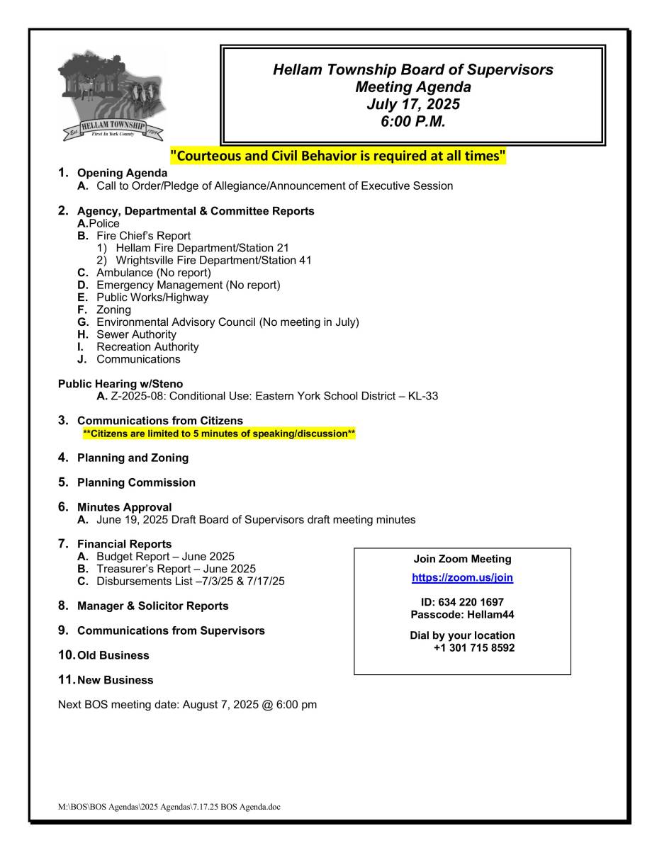 The Hellam Township Board of Supervisors meetings are regularly scheduled to occur the 1st & 3rd Thursday of the month. They take place in-person at the Hellam Township Municipal Complex, located at 35 Walnut Springs Road York, PA 17406, at 6PM. Meetings maybe be cancelled for various reasons, so please check our website for scheduling details, at www.hellamtownship.com