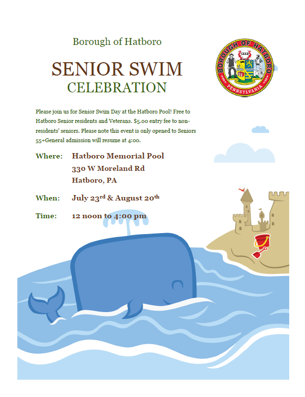 Please join us for Senior Swim Day at the Hatboro Pool! Free to Hatboro Senior residents and Veterans. $5.00 entry fee to non-residents' seniors. Please note this event is only opened to Seniors 55+. General admission will resume at 4:00.
