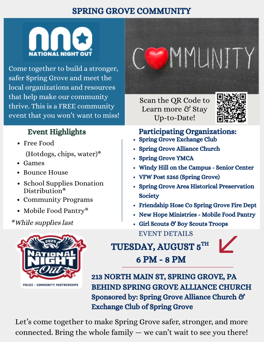 National Night Out will be held on Tuesday, August 5, 2025, from 6-8 pm at 213 N Main St, Spring Grove, PA (Behind Spring Grove Alliance Church).