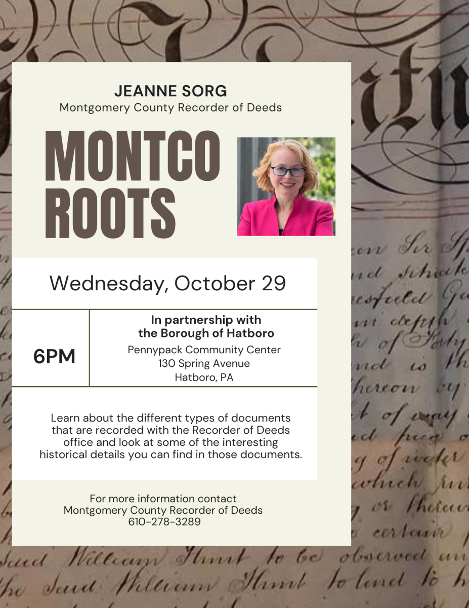 Join the Montgomery County Recorder of Deeds, Jeanne Sorg, and representatives in her office for the Montco Roots Presentation! This event will be taking place on October 29, 2025 beginning at 6 PM at the Pennypack Community Center, 130 Spring Avenue, Hatboro, PA 19040.