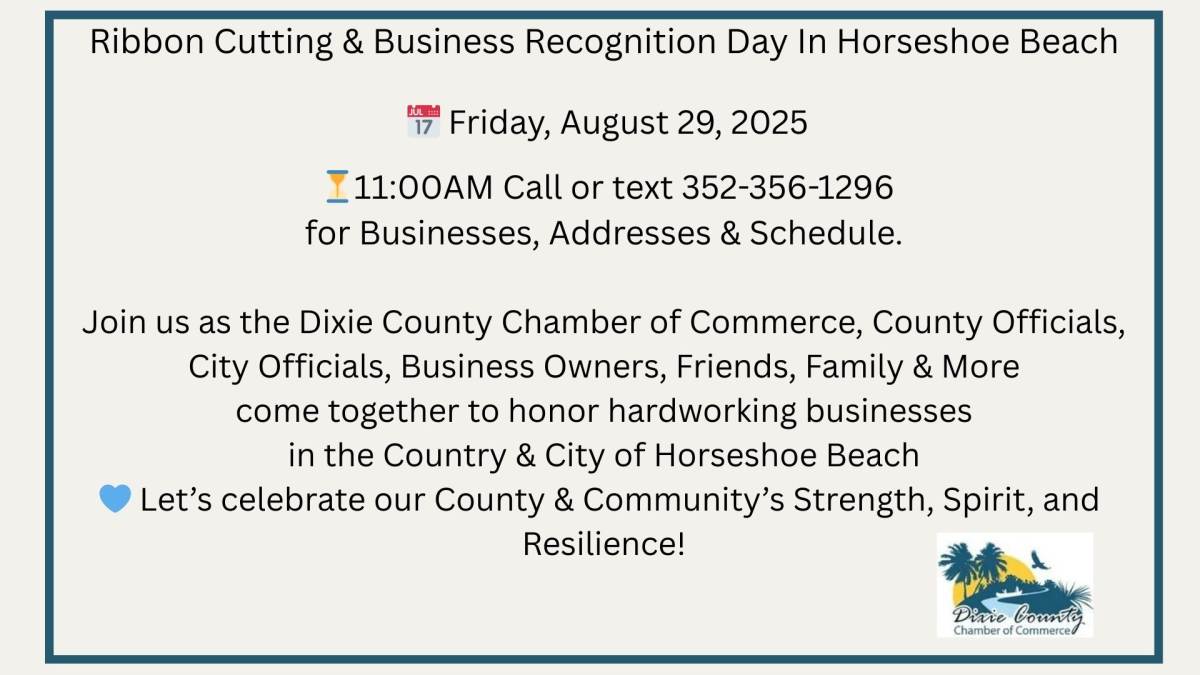 Join us as the Dixie county Chamber of Commerce, County Officials, Town Officials, Business Owners, Friends, Family and More come together to honor hardworking businesses in the Country & Town Officials of Horseshoe Beach.