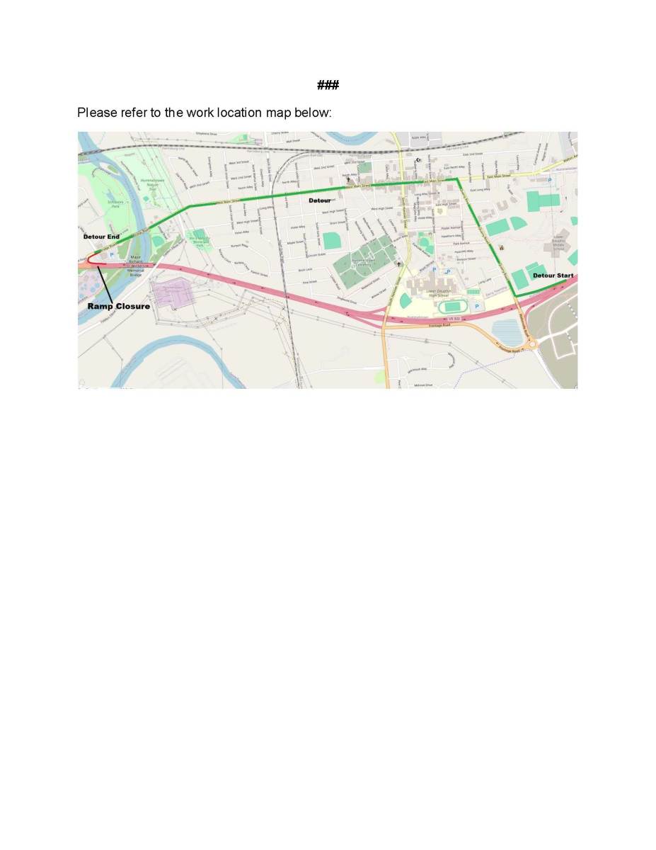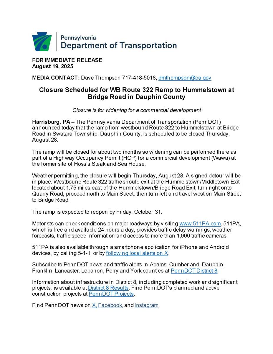 The Pennsylvania Department of Transportation announced that the ramp from westbound Route 322 to Hummelstown at Bridge Road is scheduled to be closed on Thursday, August 28, weather pending.